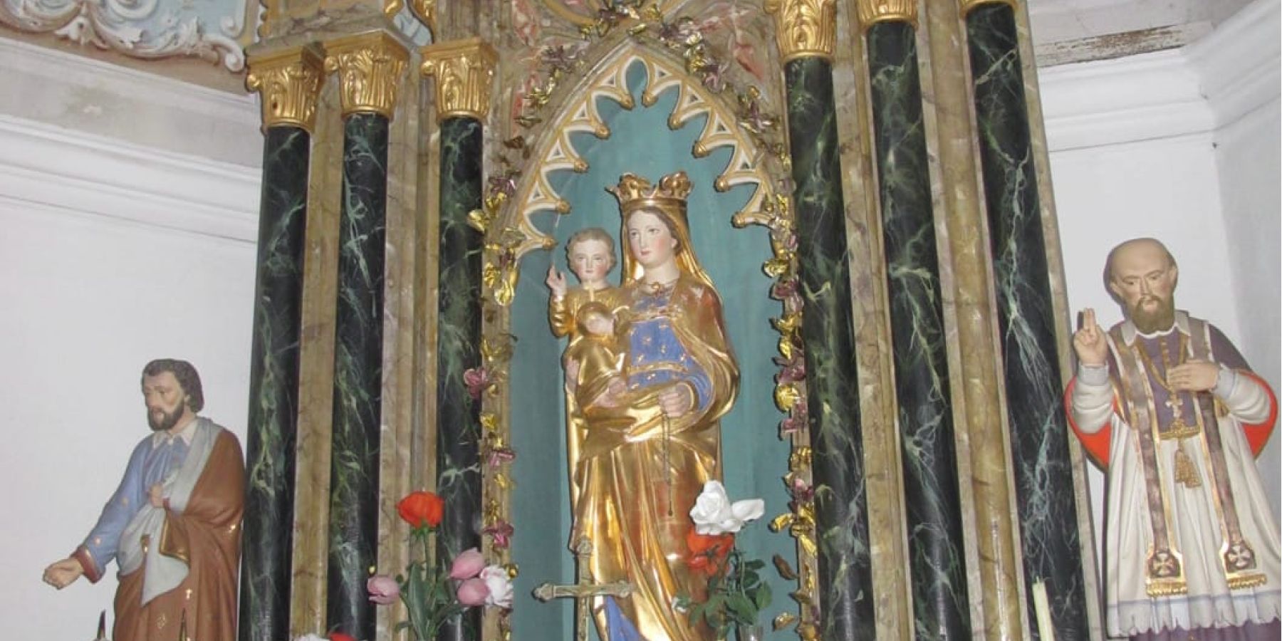 Le bâtiment, constamment entretenu et soigné par les familles et les habitants du hameau, abrite un autel en bois sculpté avec trois statues : la Vierge, St Joseph et St François de Sales. Dressées sur des consoles latérales de marbre on trouve les statues en plâtre de saint Antoine de Padoue et du Sacré Cœur. Dans une armoire de bois sont rangés les vêtements ecclésiastiques et le calice.