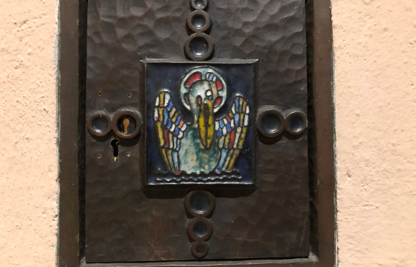 La porte du tabernacle figure le traditionnel pélican nourrissant ses petits. Elie Pellegrin a utilisé l’émail.
