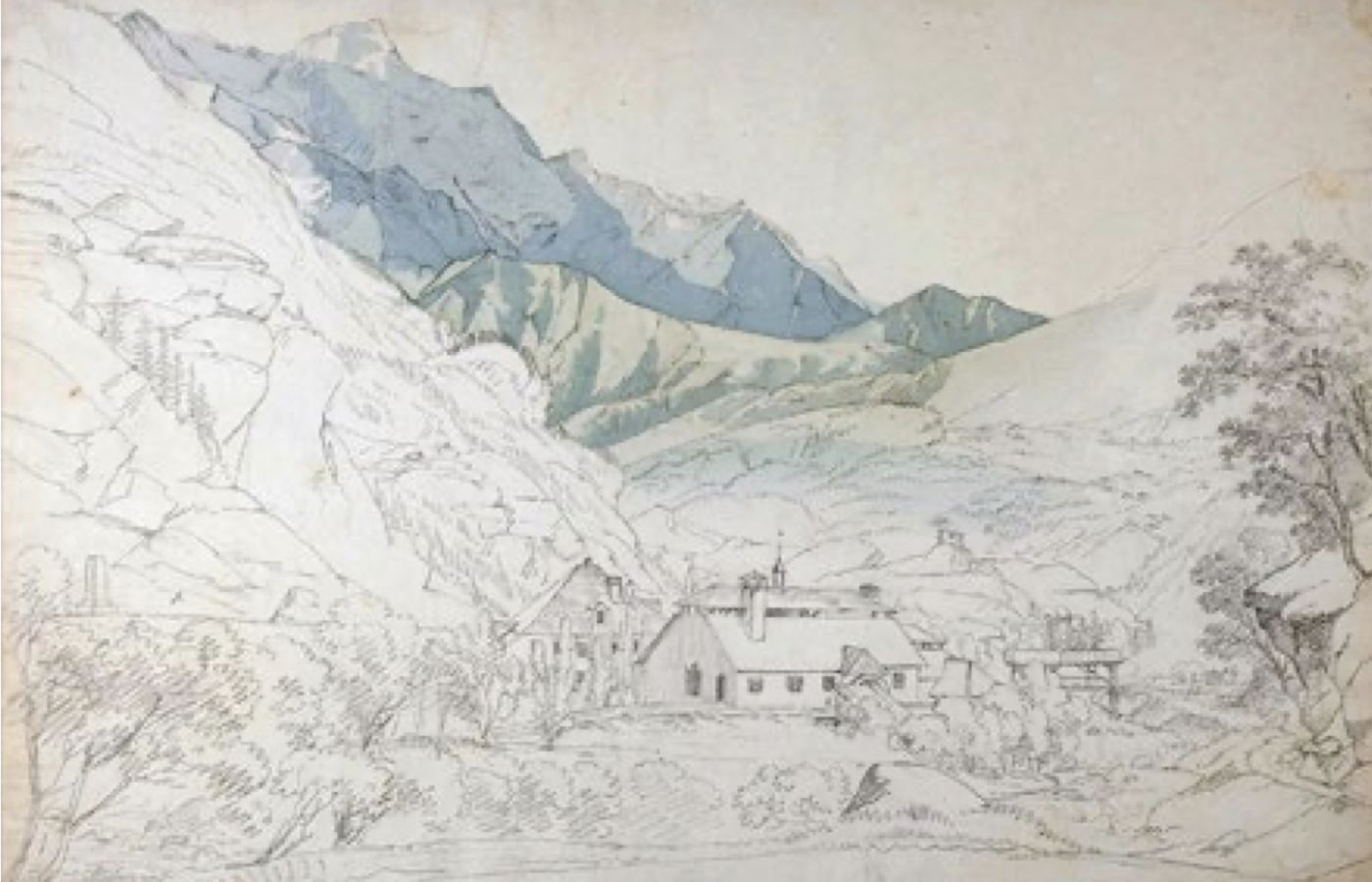 L’artiste situe la scène dans un décor de village – le Tour – délicatement éclairé par les rayons du soleil couchant sur le glacier cascadant presque jusqu’aux maisons.