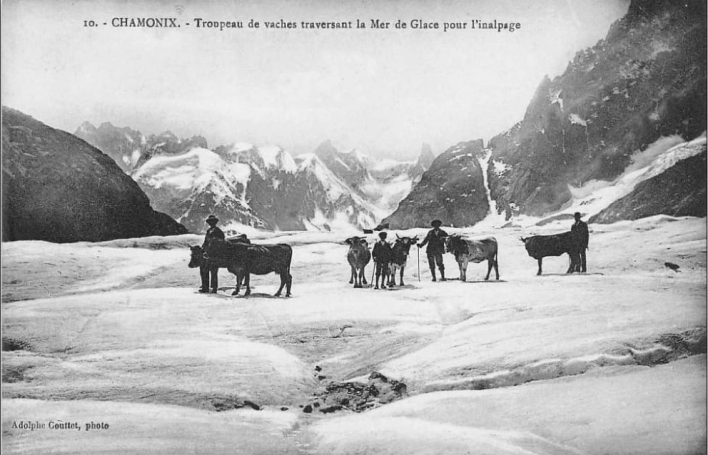 Troupeau de vaches traversant la Mer de Glace en direction de l’alpage de Bayer