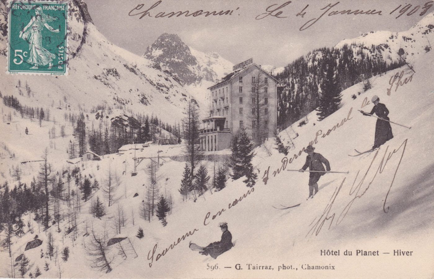 Années 1900… Tout change au Planet, quand deux familles chamoniardes, les Tairraz (marchands de vins) et les Tairraz (photographes) de croisent… par le mariage d’Auguste et de Judith qui décident de construire un hôtel là où la vue est inégalable. Après trois ans de négociations et de travaux (effectués par les frères Luchini, maçons et tailleurs de pierre), l’hôtel du Planet ouvre ses portes en 1903.