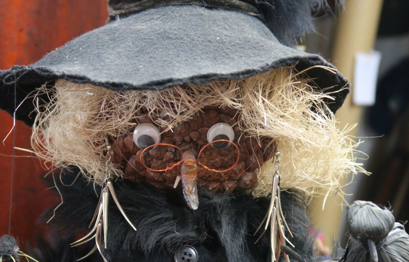 Denise assemble à la colle mais ne coud que très rarement : parfois, les plis d’un tablier ou d’un jupon… Mais ses créations naissent d’un détail : les coques ouvertes d’une cacahuète prennent à ses yeux la forme de sabots à l’intérieur desquels elle imagine déjà les jambes ; le reste du personnage suivra. Parfois, elle verra dans un cône pointu le chapeau d’une future petite sorcière. De jolies mains de poupée de collection avaient atterri, inertes, dans son atelier : Denise leur a redonné vie en les « greffant » au bout des bras d’une inconnue… Ça part avec une matière, un sujet, presque rien, et déjà le détail a pris sa place et je vois le produit fini. Je n’exclus aucun matériau à priori, et j’avance à l’instinct. J’ai la chance de pouvoir imaginer le produit fini, je perds moins de temps.