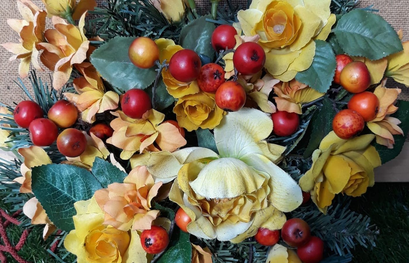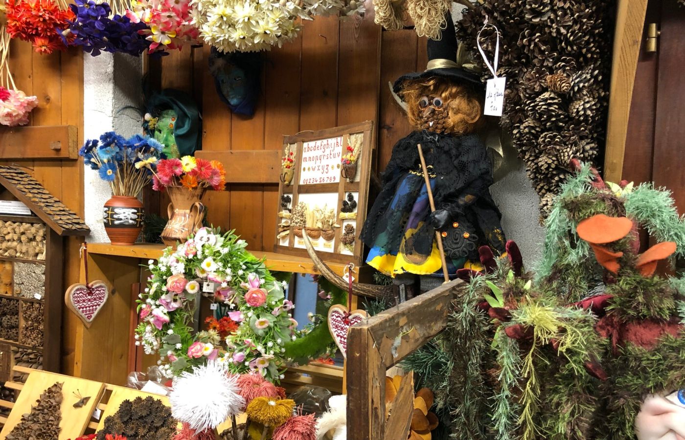 C’est ainsi que travaille Denise : une imagination débordante et des doigts agiles lui permettent de composer divers bouquets ou figurines, tableaux, statuettes ou bracelets, ou encore couronnes de l’Avent ou couronnes pour les gagnantes des Combats des Reines ! Quelle que soit la structure, quelle que la soit la nature, végétale ou minérale : tout peut être utilisé, des écorces aux branches, des plumes aux lichens ou aux coquilles d’escargot, mais aussi les brins de laine, les boutons, les perles ou les chutes de tissu… Tous ces matériaux sont soigneusement classés et rangés dans des casiers et des pots, à portée de main. Sensible au temps, aux couleurs, l’artiste crée selon l’inspiration que lui apporte la lumière des saisons et de la forêt où elle aime se perdre, avec, comme seule compagne, sa chatte. Elle est mes yeux et mes oreilles, je vais voir où elle renifle et j’y découvre un nid d’écureuil… Une vipère, un oiseau… l’instant est vite passé ! La forêt est mon domaine. L’odorant mélèze aux couleurs changeantes voisine l’apaisant bouleau au tronc blanc et à la sève bienfaisante au printemps.