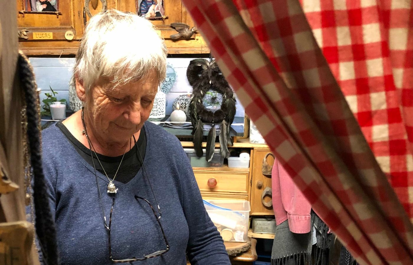 Aujourd’hui, Denise enrubanne soigneusement un vieux cercle métallique d’abat-jour avec de la laine, l’armature d’un futur attrape-rêve. À l’intérieur du cercle, une « toile d’araignée » de fils finement noués à la main capturera les cauchemars lesquels seront vite évacués grâce aux trois ou quatre rubans ou plumes suspendus dans le bas du cercle. C’est une tradition amérindienne, je ne sais pas pourquoi, mais depuis toujours je suis attirée par cet objet traditionnel (…) Il faut, de temps en temps, l’accrocher au soleil, pour qu’il se « recharge ». Enfin, c’est mystérieux, mais jamais anodin ! Parfois, on lui demande d’y introduire une perle, une plume ou quelque chose ayant appartenu à quelqu’un de cher. L’attrape-rêve se transforme alors en écrin de souvenir précieux. La longue période de confinement, très mal vécue par tous, a révélé, à travers l’attrape-rêve, le mal-être de chacun. Ce n’est pourtant que trois plumes et trois perles, mais c’est un objet que l’on achète à quelqu’un qui l’a fait. On ne l’achète pas à l’importe qui.