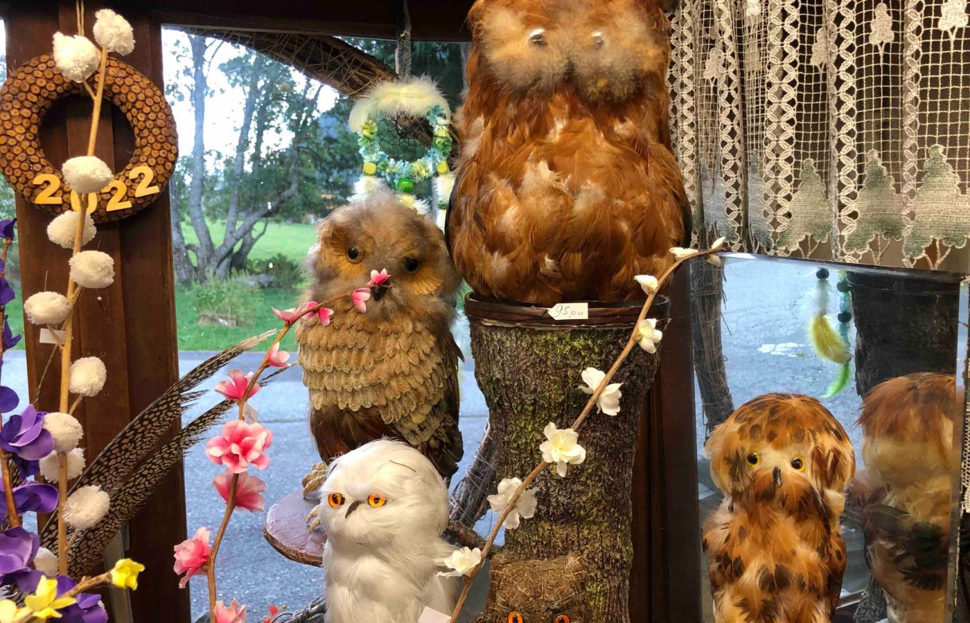 Cotoyant de multiples bouquets de fleurs – vraies ou fausses -, voisinant des tableautins de graines, d’écorces, de lichens… trônent de magnifiques chouettes, superbes rapaces que la mythologie grecque associe à la déesse Athéna et à qui sont attribués les dons de clairvoyance, sagesse, mystère, intelligence et protection. Des boutons figurent les yeux ; des plumes ou des écorces le corps…