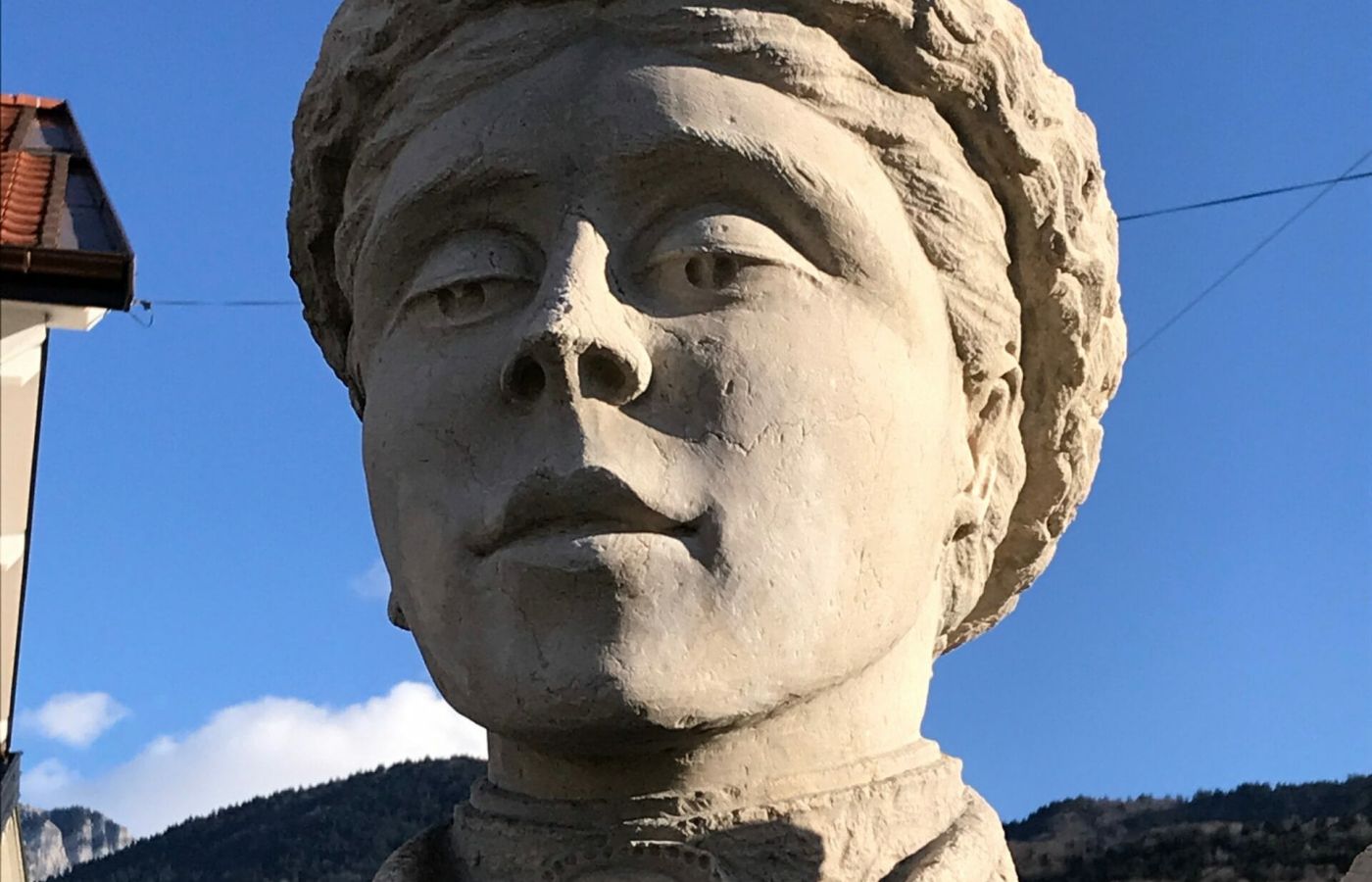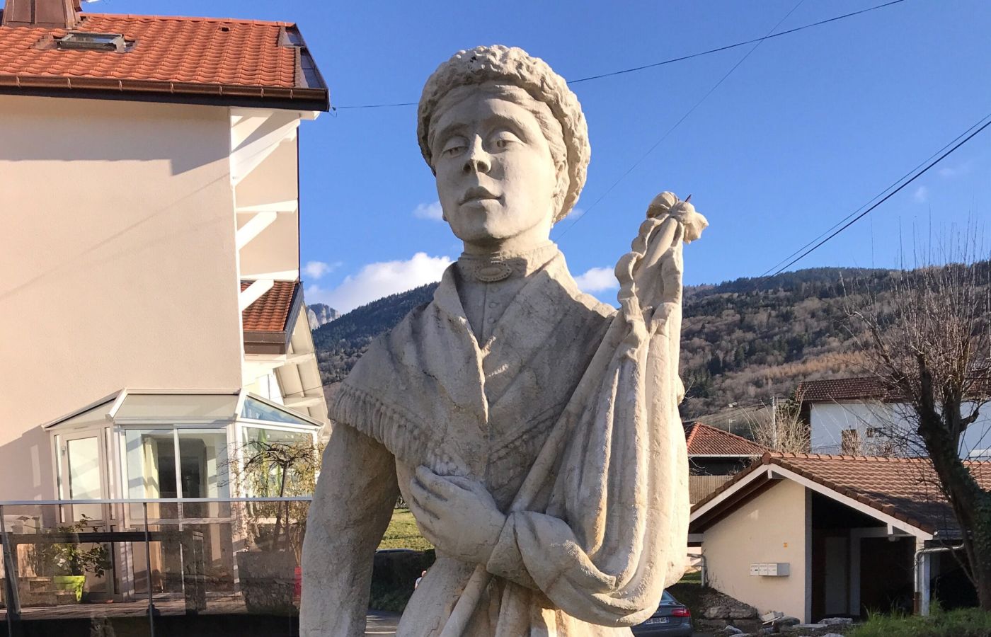 Un mois plus tard, en octobre 1921, la petite mairie de Lugrin, riveraine du Léman, inaugure à son tour son monument aux Morts. Taillant dans la pierre de roche du Jura et travaillant à la boucharde fine, les marbriers de Thonon Décorzent et Gavazzi ont souhaité représenter une Savoyarde vêtue de son costume traditionnel, couronne de laurier d’une main et drapeau français de l’autre, pleurant dans la dignité ses enfants morts pour la patrie.