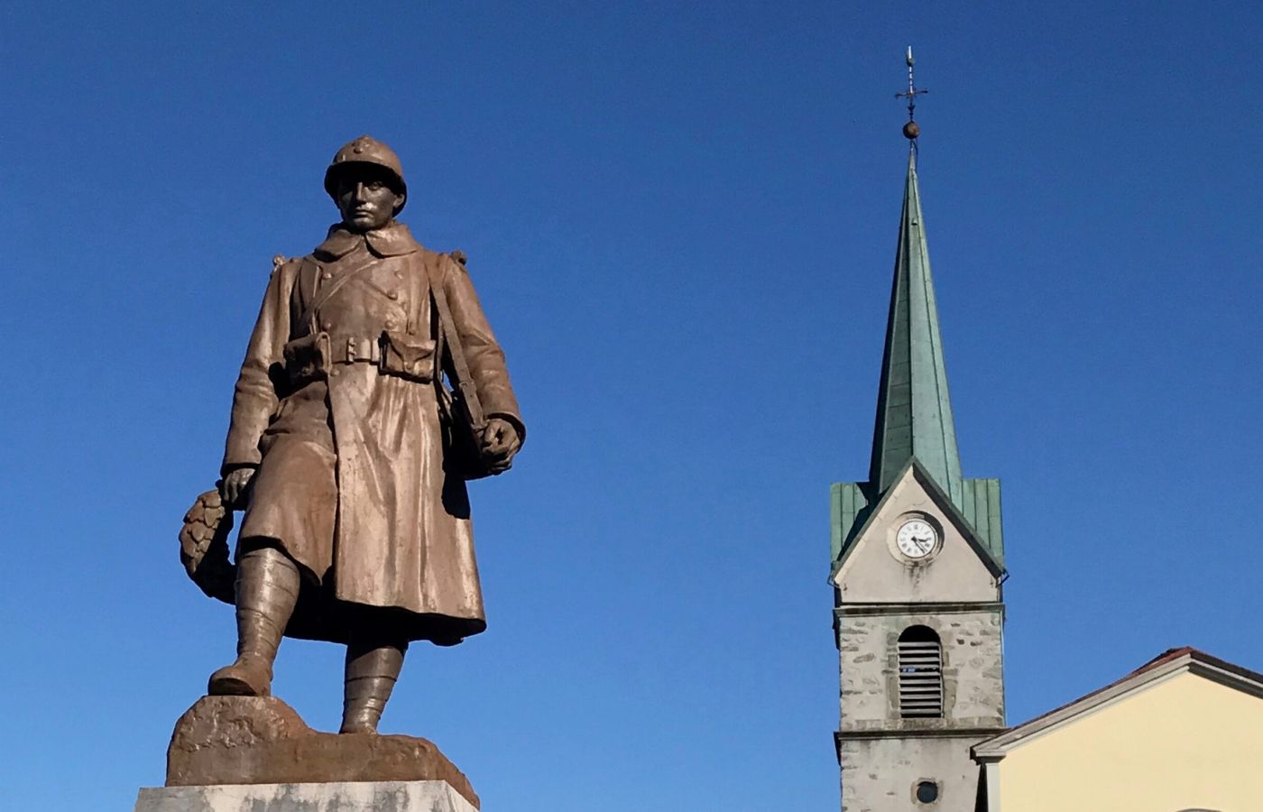 En 1926, enfin, une statue de Poilu viendra prendre la place qui lui était due, dressée sur un haut socle de calcaire : copie conforme de notre « Poilu » de Chamonix et comme sortie du même moule, Charles Gos aurait pu, de la même façon, écrire à son propos : « sublime guerrier de bronze, campé sur son socle… La capote relevée découvre les jambes musclées, bandées de molletières ; il est lourdement chargé de tout l’équipement que le front assigne aux combattants, le fusil en bandoulière, le casque sur le passe-montagne… » Seul, lui manque le rotin à la main !…