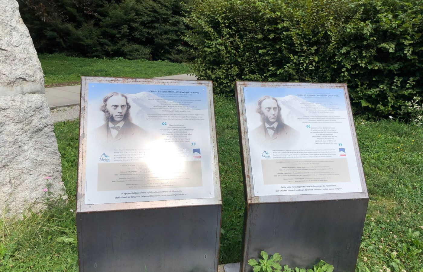 Une plaque commémorative (en français et en anglais) accompagne la stèle, témoignant ainsi la solidité des liens entre l’Alpine club et la ville de Chamonix et, au-delà, entre tous les alpinistes de la communauté montagnarde.
