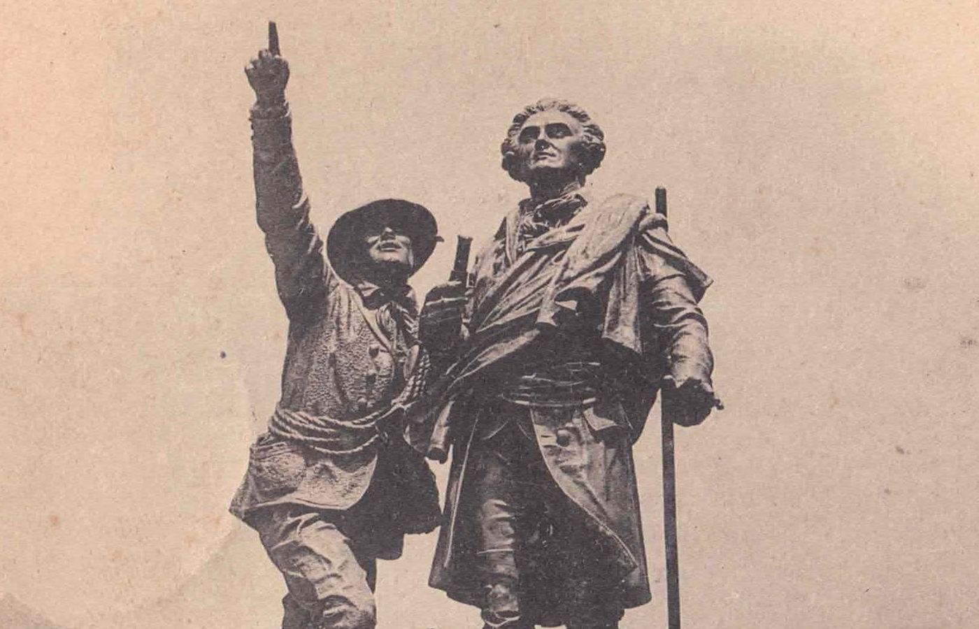 Au centre de Chamonix, statue de Jacques Balmat et d’Horace Benedict de Saussure – Carte postale ancienne de 1903.