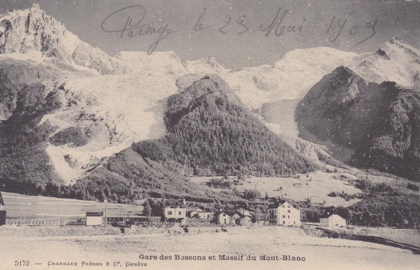 En 1901, lorsque le premier petit train siffle son arrivée à la gare des Bossons, il ne voit guère autour de lui que des champs et des prés. Il se trouve au lieu-dit « Les Mouilles des Bossons ». De nombreux ruisseaux, émissaires du glacier des Bossons, ont créé cette zone marécageuse qu’il a fallu drainer d’un caniveau tout autour du bâtiment de la gare.