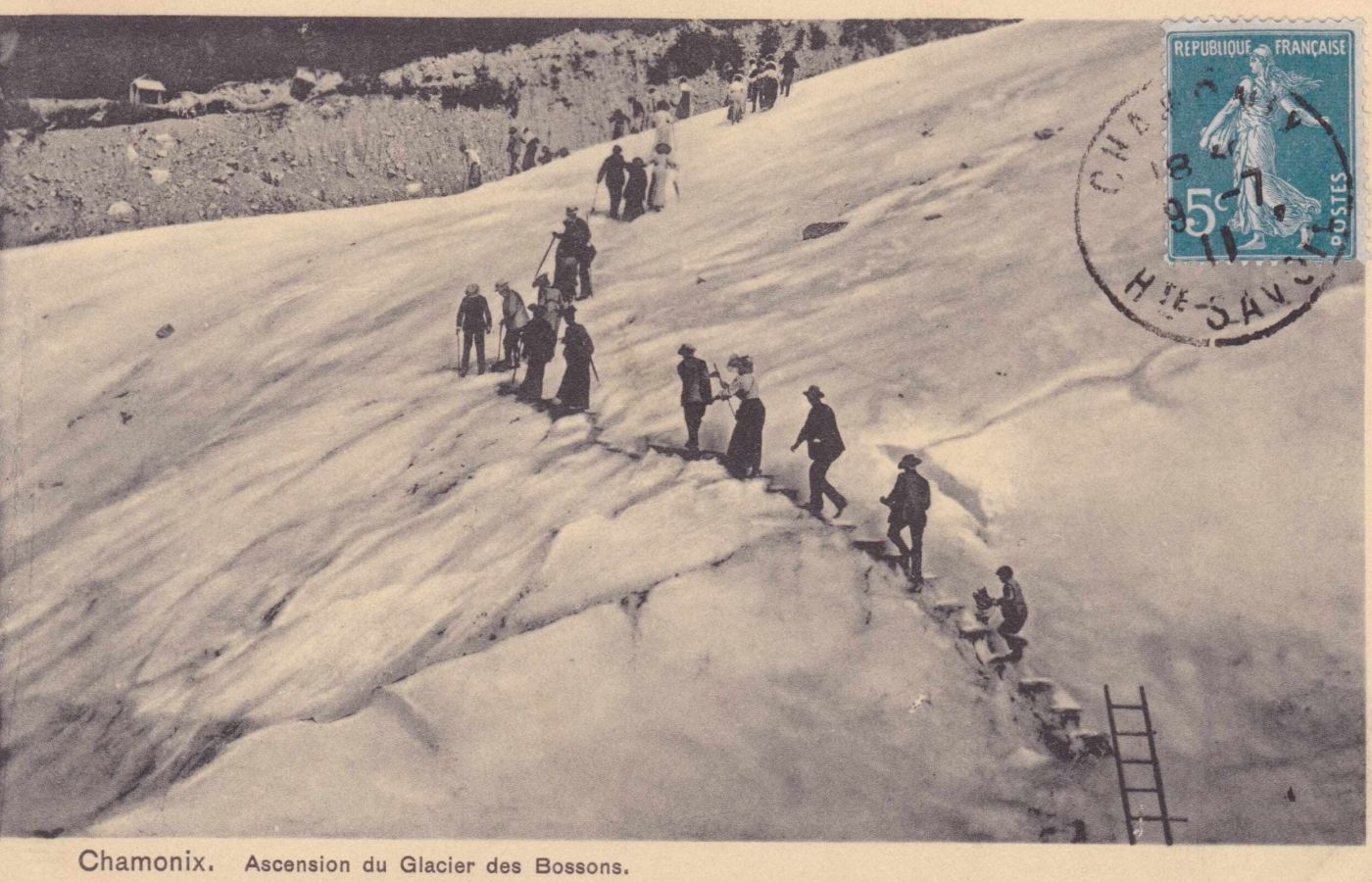 1911 – Caravane d’excursionnistes traversant le glacier des Bossons. On distingue, sur la rive droite, le rocher qui a donné son nom à la buvette du Céro = rocher brûlé (de couleur rougeâtre).