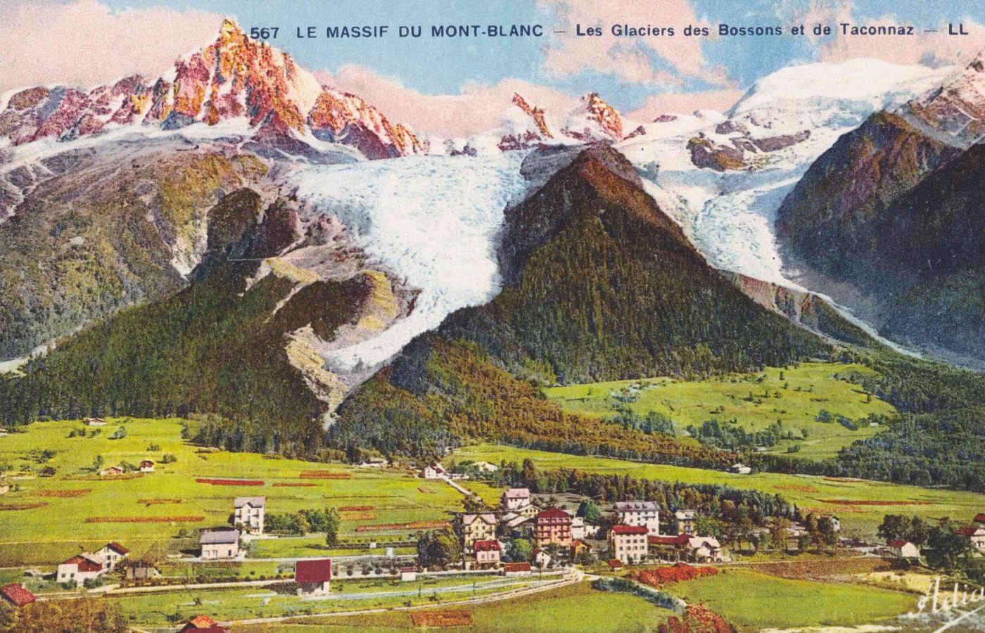 Années post-1926 : les hôtels ont « poussé » à proximité de la gare des Bossons. On remarque encore de nombreux champs cultivés autour de ce qui deviendra le cœur du village.