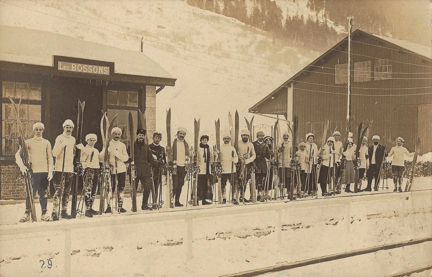 1924 à la gare des Bossons : les skieurs de retour du tremplin du Mont