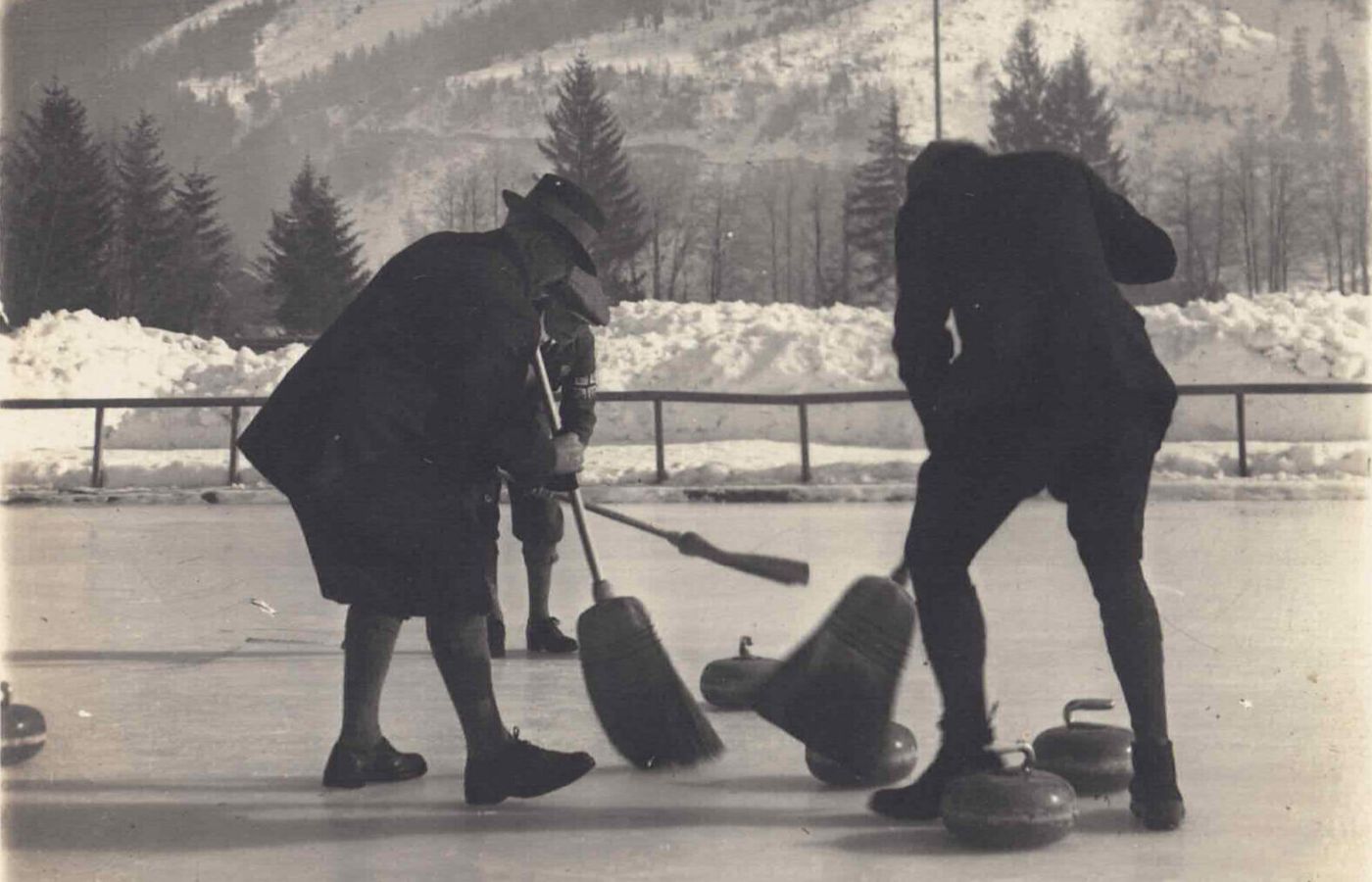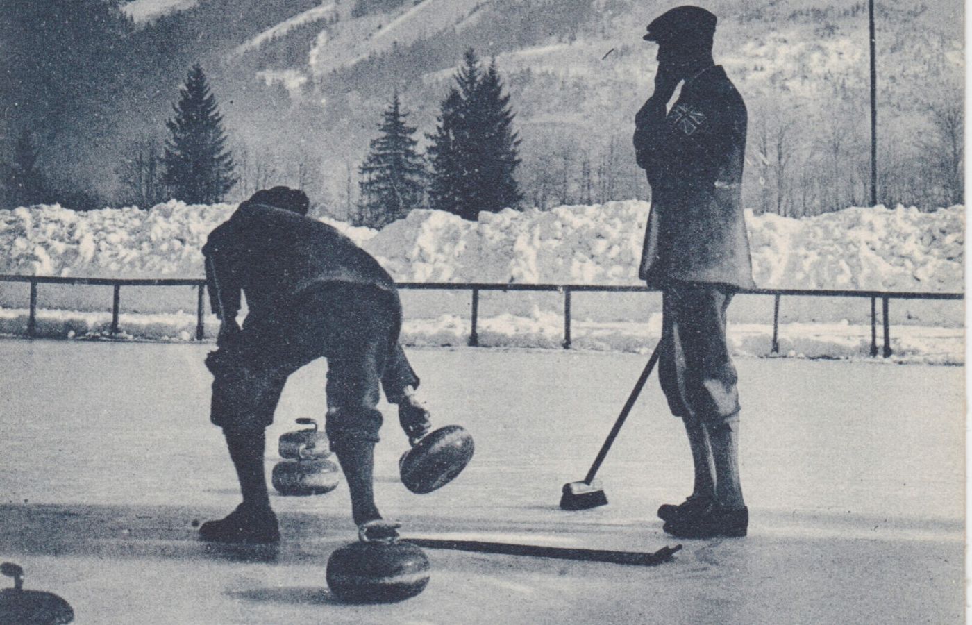 Pendant que les patineurs les plus réputés du monde entier s’évertuent sur la grande piste, les « pépères » du sport s’entraînent au curling sur l’un des linkes spéciaux. Le curling rappelle beaucoup le jeu du palet de notre enfance, ou le jeu de boules de notre âge mûr ; pas de cochonnet et pas de bouchon, le but qu’il faut approcher est un point marqué sur la glace et entouré de trois cercles concentriques.