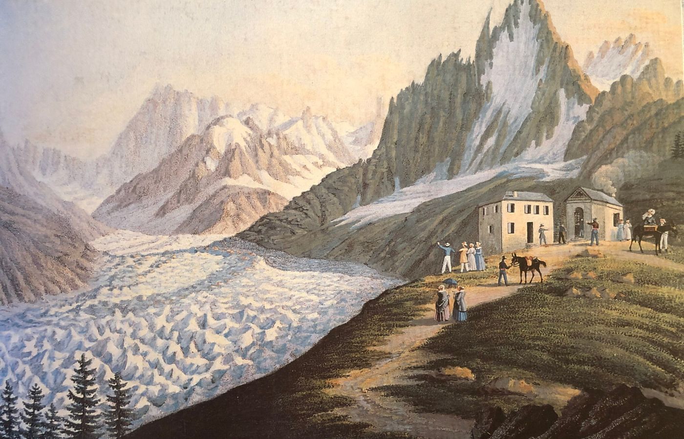 Voilà la description que nous en fait, en juillet 1791, une voyageuse du nom de Marie-Josepha Holroyd : « C’est un paysage magnifique et aucune description n’en peut rendre l’effet. Le glacier fait un grand contour vers les montagnes du fond et ressemble exactement à une mer démontée. Nous avions emporté avec nous un repas froid et du champagne, et nous avons bu à la santé du Prince de Galles dans l’Hospice de Blair, construit par un anglais de ce nom. »