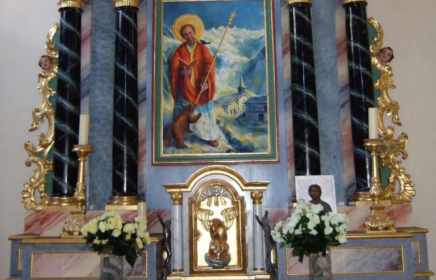 Lors de sa restauration, on va s’attacher à lui redonner son identité primitive. Les décors peints de la voûte sont fidèlement transposés : couleurs, formes, motifs… et les tons utilisés – or, bleu-nuit ou rouge-brique – se calquent sur les reflets du marbre et des dorures du retable, ainsi que sur le drapé de la chasuble qui habille le saint patron. Cumulant ses talents d’ébéniste et ses connaissances historiques en matière d’art et d’architecture, René Simond se charge de la réparation du retable, effaçant les traces des travaux successifs et redonnant à l’ensemble une unité de style. S’inspirant des feuillages latéraux avec angelots ainsi que du style Empire de la partie supérieure, il reconstruit les faux marbres encadrant le tabernacle et son symbolique pélican. C’est à l’artiste-peintre Lionel Wibault qu’est confiée la tâche de représenter, sur le tableau central, le saint patron de la chapelle, archidiacre irlandais en poste à Aoste. On le voit ici portant ses vêtements sacerdotaux et tenant, traditionnellement, son sceptre dans la main gauche et une bible ouverte dans la main droite. À ses pieds se tient un ours, animal qui rappelle le nom du saint protecteur, et symbolise la dévotion des fidèles. Un choucas, oiseau-fétiche des montagnards, est posé sur son épaule, privilège des hommes au cœur pur.