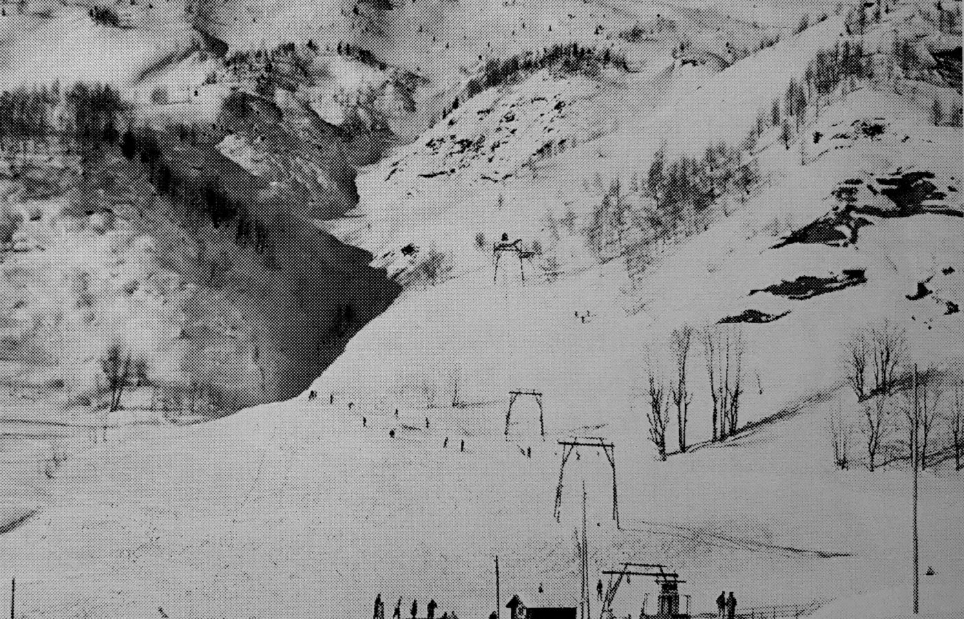 1957 le téléski des Plânes implanté dans les prés derrière le village