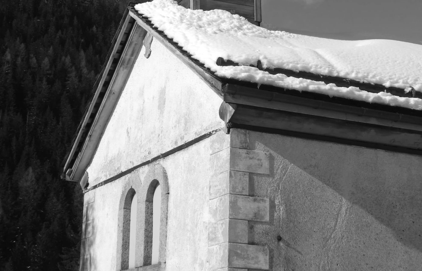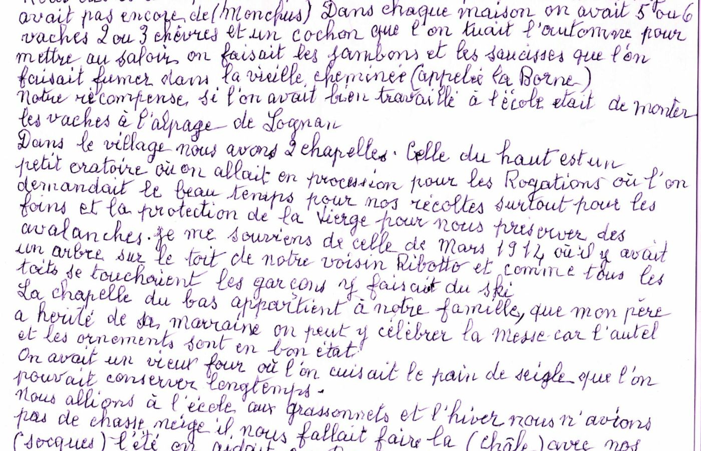 Dans le village, nous avons 2 chapelles. Celle du haut est un petit oratoire où on allait en procession pour les Rogations où l’on demandait le beau temps pour nos récoltes, surtout pour les foins et la protection de la Vierge pour nous préserver des avalanches. Je me souviens de celle de mars 1914 où il y avait un arbre sur le toit de notre voisin Ribotto, et comme tous les toits se touchaient, les garçons y faisaient du ski.