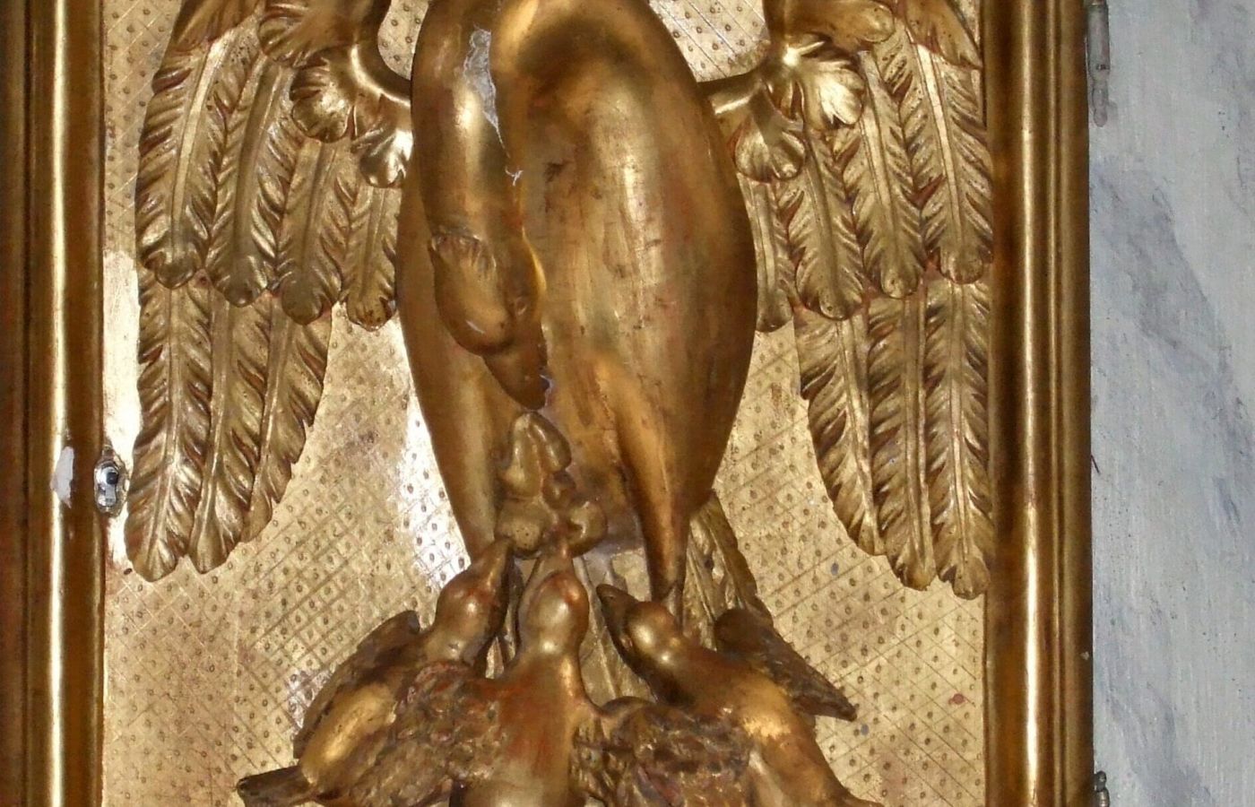 Porte du tabernacle de l’église représentant le traditionnel pélican nourrissant ses petits