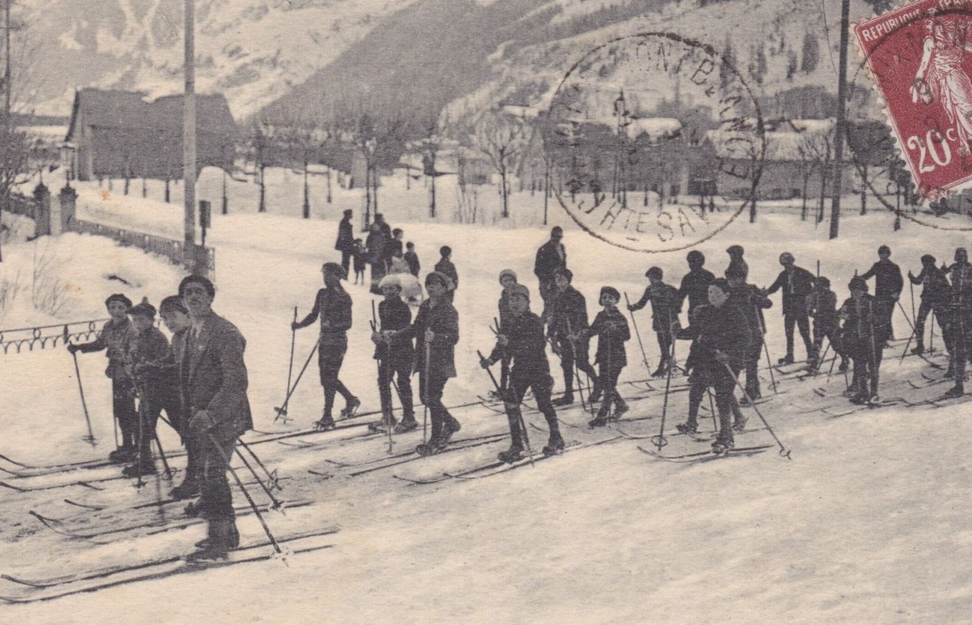 Sous la houlette du Club Alpin Français, des compétitions de ski sont organisées chaque année dès 1910, donnant aux écoliers l’occasion de se distinguer en suivant les traces des plus grands. Alfred Couttet dit « à la Colaude », qui a appris à skier sur des douves de tonneau, devient « Couttet-Champion » en 1909. Sa générosité et ses dons de pédagogue l’encouragent, dès la fin de la Grande Guerre, à ouvrir une école de ski gratuite pour les enfants du pays, pressentant combien il leur sera utile de maîtriser cette activité de plein air dont les hivernants sont friands. En 1920, ses premiers 9 élèves (ils seront 96 en 1936) suivent leur maître incontesté dans l’art du télémark avec sa célèbre génuflexion et dessinent à leur tour une volute parfaite dans la neige scintillante.