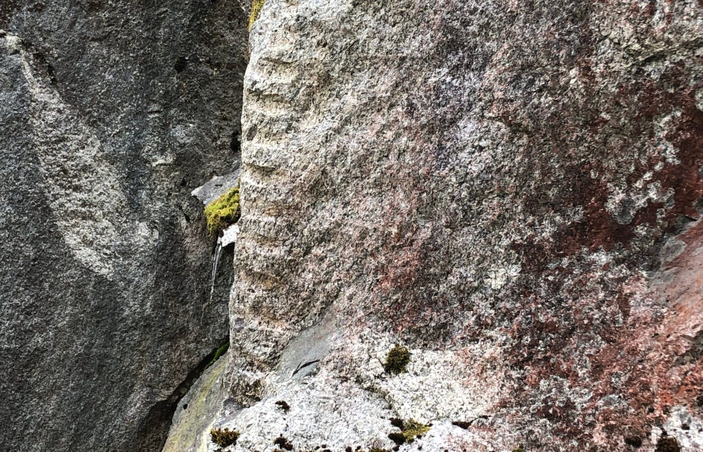 Bloc de granit dans la Moraine d’Argentière. Très régulières, se distinguent les encoches des outils des tailleurs de pierre.