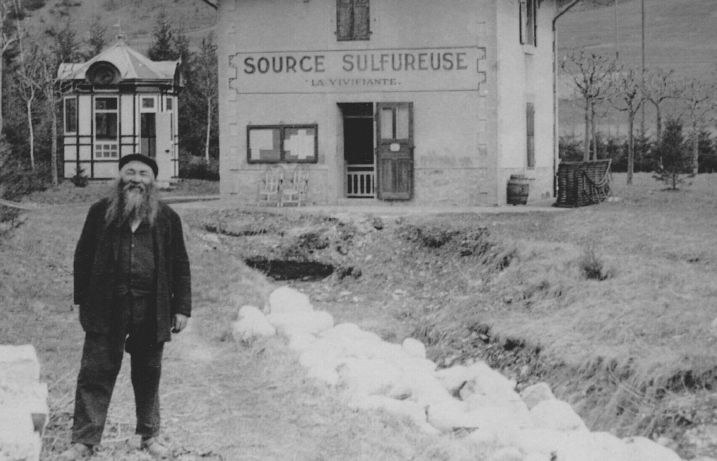 Il faut attendre 1930 et l’arrivée à Chamonix d’un certain Etienne Alphand pour voir renaître de l’intérêt pour la source sulfureuse. Originaire de Vallouise et recruté comme gendarme à Argentière, il épouse Emma Folliguet et s’installe définitivement dans la vallée. Souhaitant « ressusciter et donner l’importance qu’elles méritent à ces eaux appréciées avec juste raison par nos ancêtres », il achète les terrains et entreprend des travaux de réhabilitation du site : assainissement, captage et analyse de l’eau laquelle semble se conserver parfaitement en bouteille. Etienne Alphand fait construire un petit bâtiment destiné aux curistes qui viendront, sur place, profiter des bienfaits de la source baptisée « La Vivifiante« . Tout proche, un kiosque à musique abrite de petits orchestres. À l’entrée de la propriété, un portail de fer forgé et d’imposants piliers de granit ouvrent sur une large allée cavalière. Promise à « un très grand avenir » dans un site splendide, cette source tombe néanmoins en désuétude. Avec l’avènement des sports d’hiver et l’explosion de l’alpinisme, la petite maison est désertée. Mais les habitants du pays gardent tout de même, pendant très longtemps, l’habitude de venir remplir leurs bouteilles avec cette eau au goût exécrable mais qui, paraît-il, fait du bien.